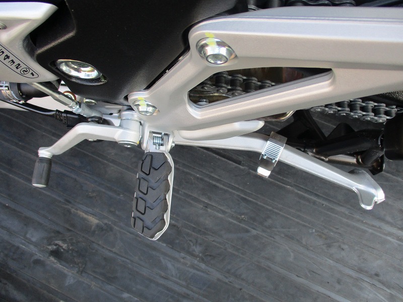 センタースタンドで隠れてしまうツーリズモ・ヴェローチェのサイドスタンドの””先端 “。スタンドの出し入れで、ヒヤッとすることも・・・そんな悩みを解消するのがこの「サイドスタンドスイングサポート」 転ばぬ先の・・・ですね。